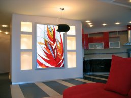 Витражи размещаются на стенах в виде панно, которые смотрятся не хуже, чем картины. Витражные панно могут быть навесными или встраиваемыми в стену. Таким нехитрым образом можно преображать длинные коридоры или вносить яркие краски в скучный интерьер.