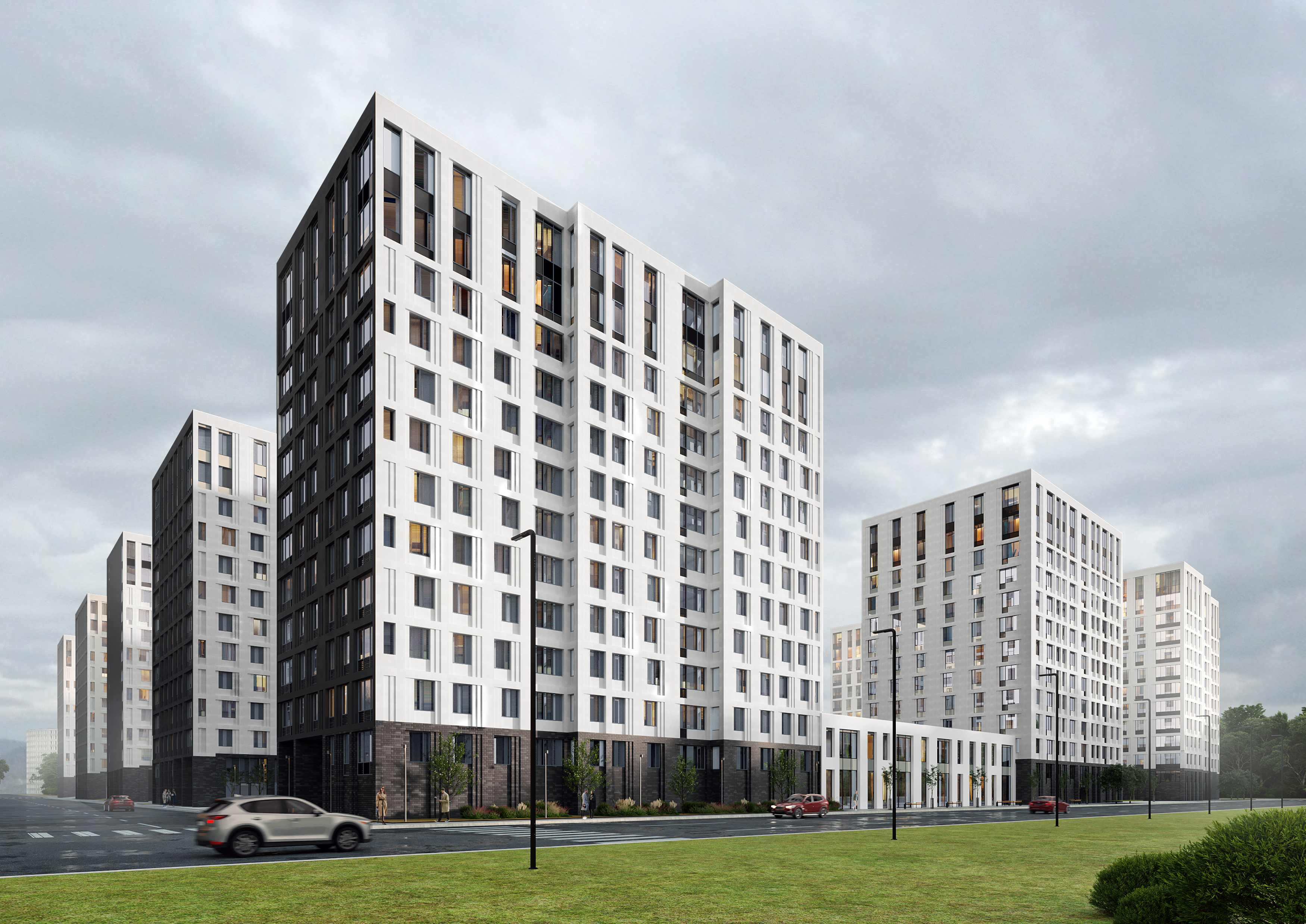 Закрытый двор организуют по концепции «без машин» и комплексно озеленят. Здесь установят детские и спортивные площадки. В жилом комплексе запроектирована полузаглубленная парковка на 841 место. В стилобате с коммерческими площадями после сдачи проекта откроются магазины, кафе, офисы и многое другое. На территории предусмотрен детский сад на 100 мест.