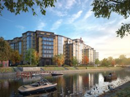 Жилой комплекс Ostrov представляет собой один корпус, создающий закрытый от посторонних уютный двор. |