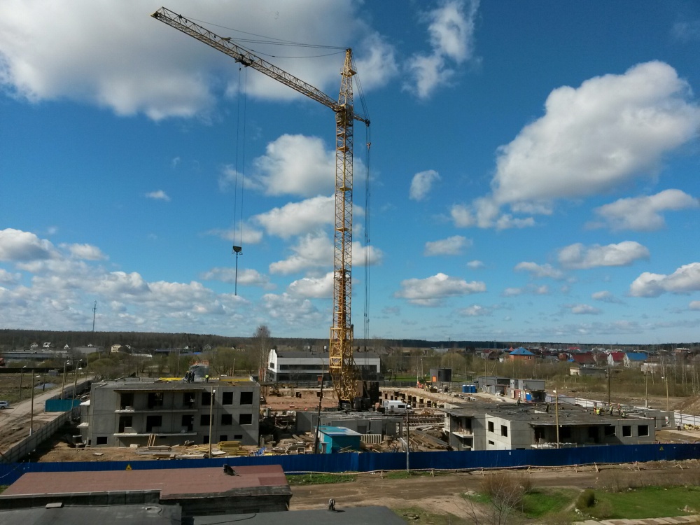 В корпусе номер 1 строители приступили к монтажу первого этажа. Из-за сильного ветра башенный кран пока не может работать в полную силу.